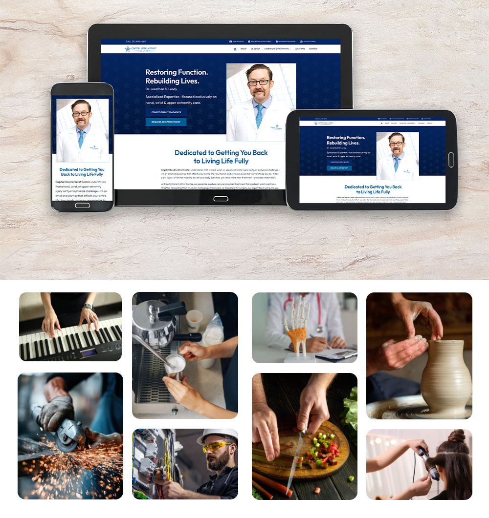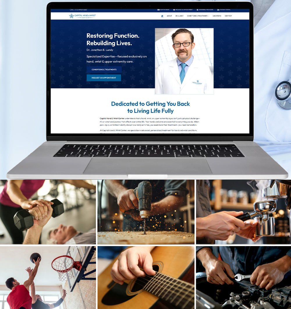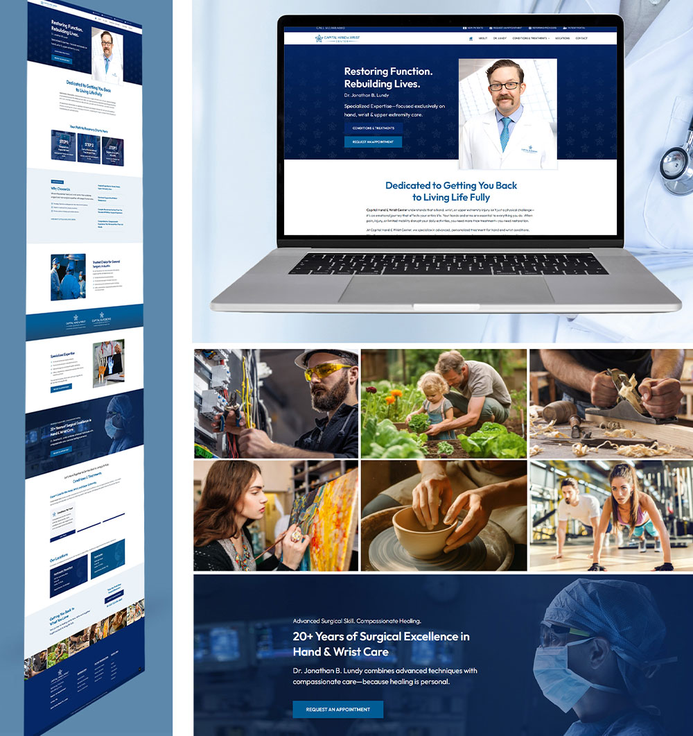 A fully branded website (capitalhandwrist.com) showcasing Dr. Lundy’s credentials, fellowship training, military service, and surgical expertise. - Educational Content
